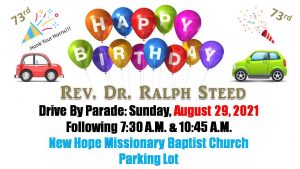 Drive by and wish Rev. Dr. Ralph Steed a Happy 73rd Birthday, here at New Hope Missionary Baptist Church Parking Lot after 7:30 A.M. & 10:45 A.M. service. Wear your mask and join the drive by parade to help Pastor Steed celebrate his special day!!!