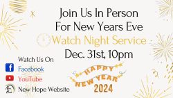10:00 P.M. Watch Night Service: Looking Forward January 1, 2024 Rev. Dr. Ralph Steed View Audio https://1.churchdev.tv:5443/nhmbcps1/streams/streams/nhmbcps-org-2023-12-31_22-06-16.273.mp3SHARE ON Twitter Facebook Buffer LinkedIn Pin ItComments Nellie Gregory says January 3, 2024 at 4:57 pm I can’t get the lesson Reply New Hope Missionary Baptist Church says January 5, 2024 at 4:05 pm Good afternoon, I apologize for missing your comment. I’m not sure why the lesson loaded up as church service. I’ll keep a closer eye on it for this upcoming week. Thanks!!! Reply Leave a Reply Cancel replyYour email address will not be published. Required fields are marked *Comment * Name * Email * Website Δ Continue Reading 10:45 A.M. Service: A Look Back 7:30 A.M. Service: Looking Forward